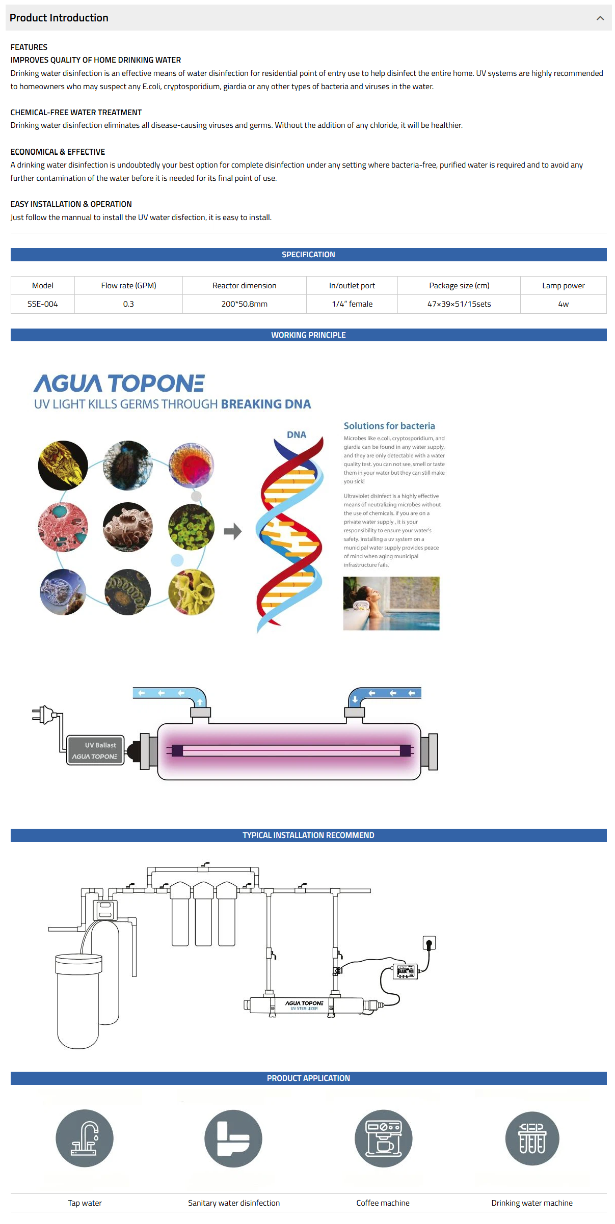 The SSE range has 8 models in the range and options to allow flexible installation, it is ideal for water tap, water disinfection system, etc.