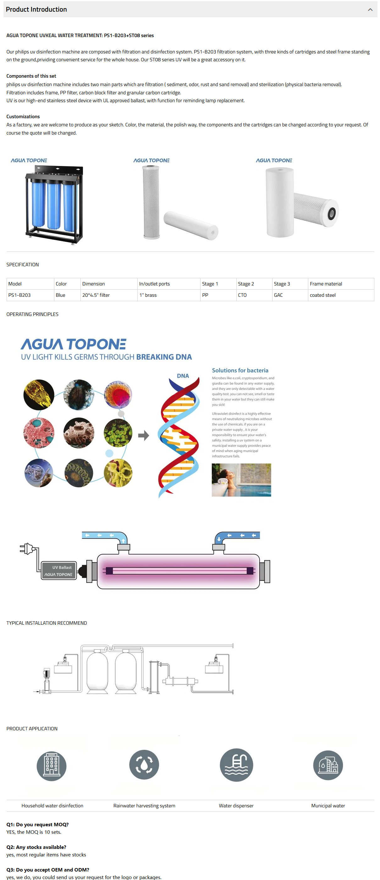 PS1-B203 filtration system, with three kinds of cartridges and steel frame standing on the ground,prividing convenient service for the whole house. Our ST08 series UV will be a great accessory on it.