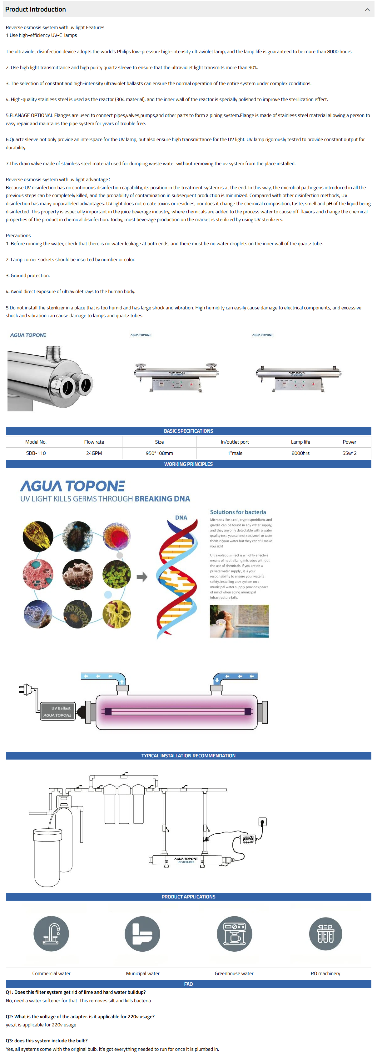 The built-in ultraviolet lamp generates short-wave ultraviolet rays with a central radiation wavelength of 253.7nm to sterilize and disinfect the water body flowing through the reaction chamber,so as to solve the problem of excessive bacterial indicators of drinking water,and make the water contaminated by bacteria meet and exceed the national drinking water related hygiene standards.