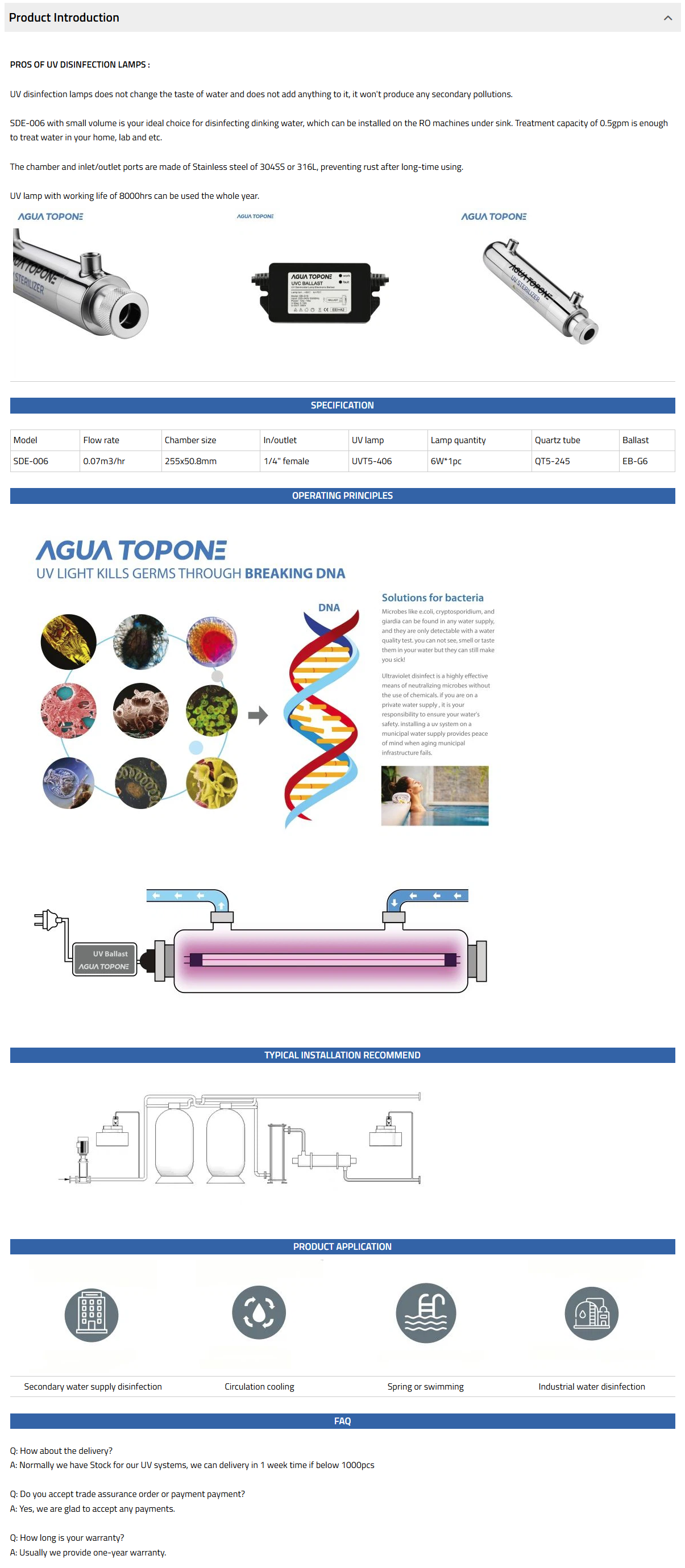 SDE-006 is one of UV water sterilizers that is proper to be installed under sink or on the RO machine with small treatment capacity household. And here are requirements for your drinking water