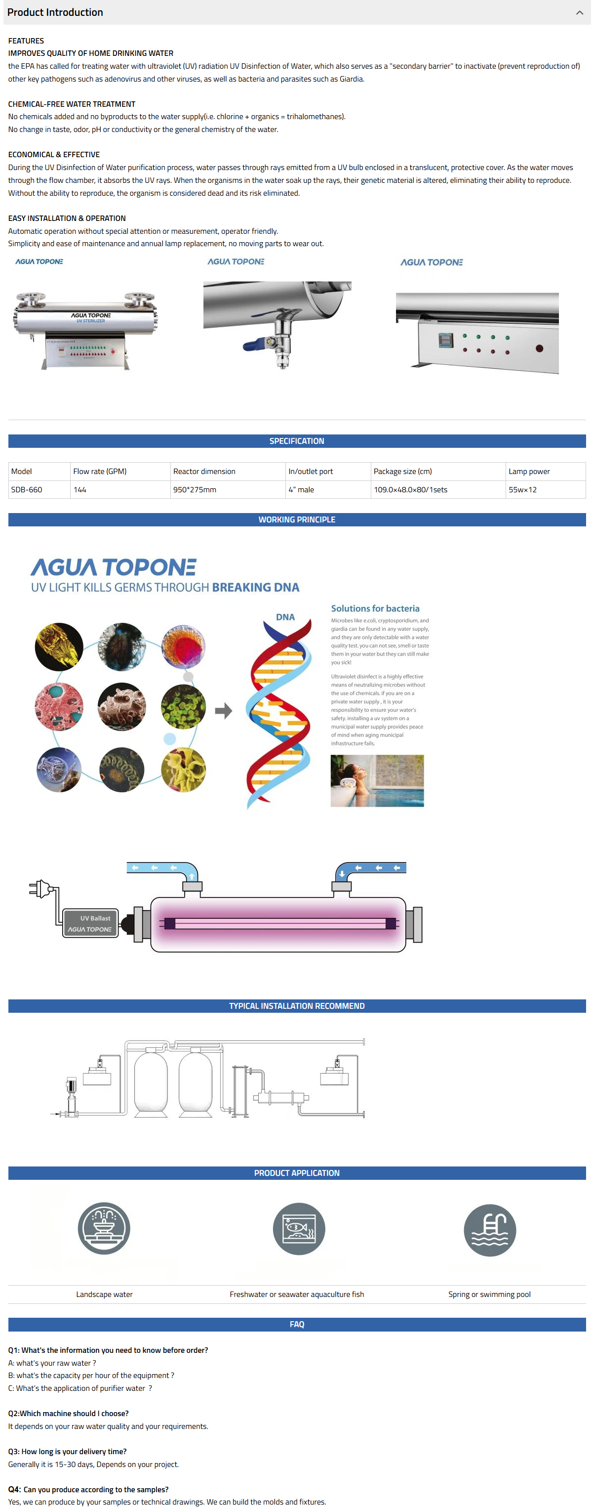 SDB UV range comes with a integrated control box underneath this ultraviolet light water treatment is highly recommended for swimming pool, hotel, school etc. The UV ballast is installed inside the control box.
