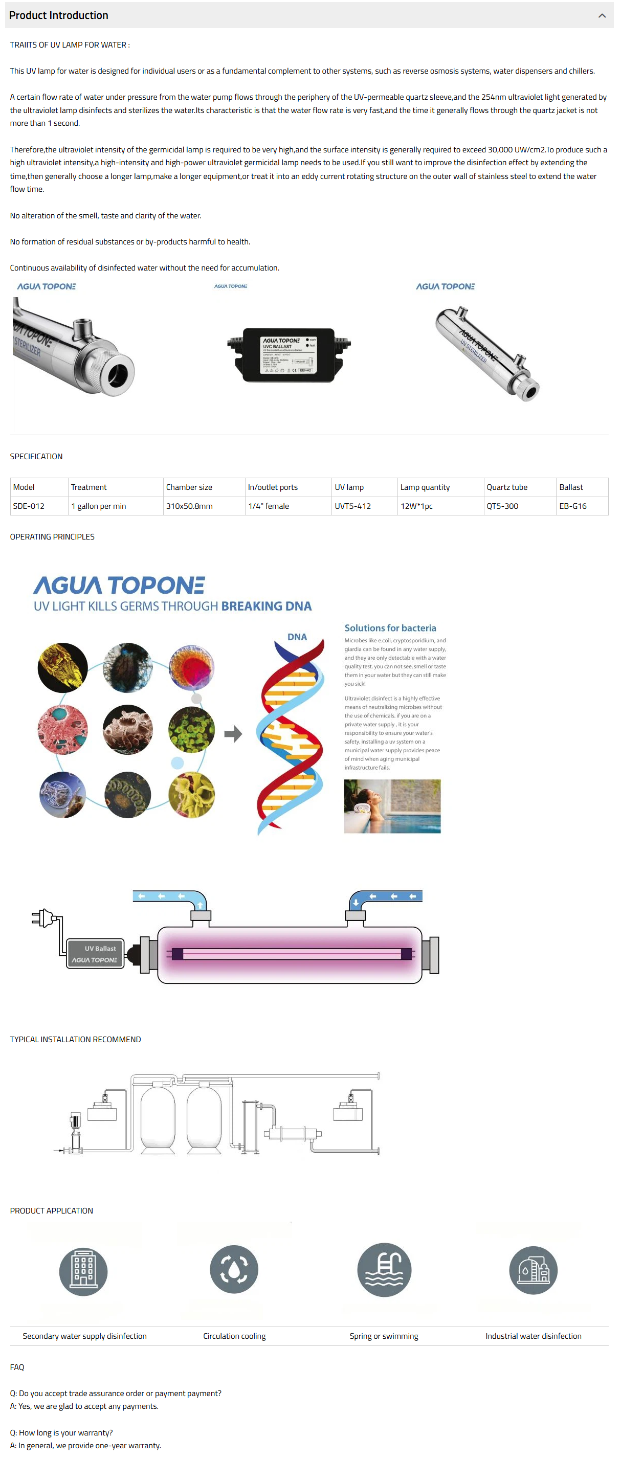 Model SDE-012 is one of UV water sterilizers which is ideal to be installed on household RO machine. Here are requirements for your drinking water