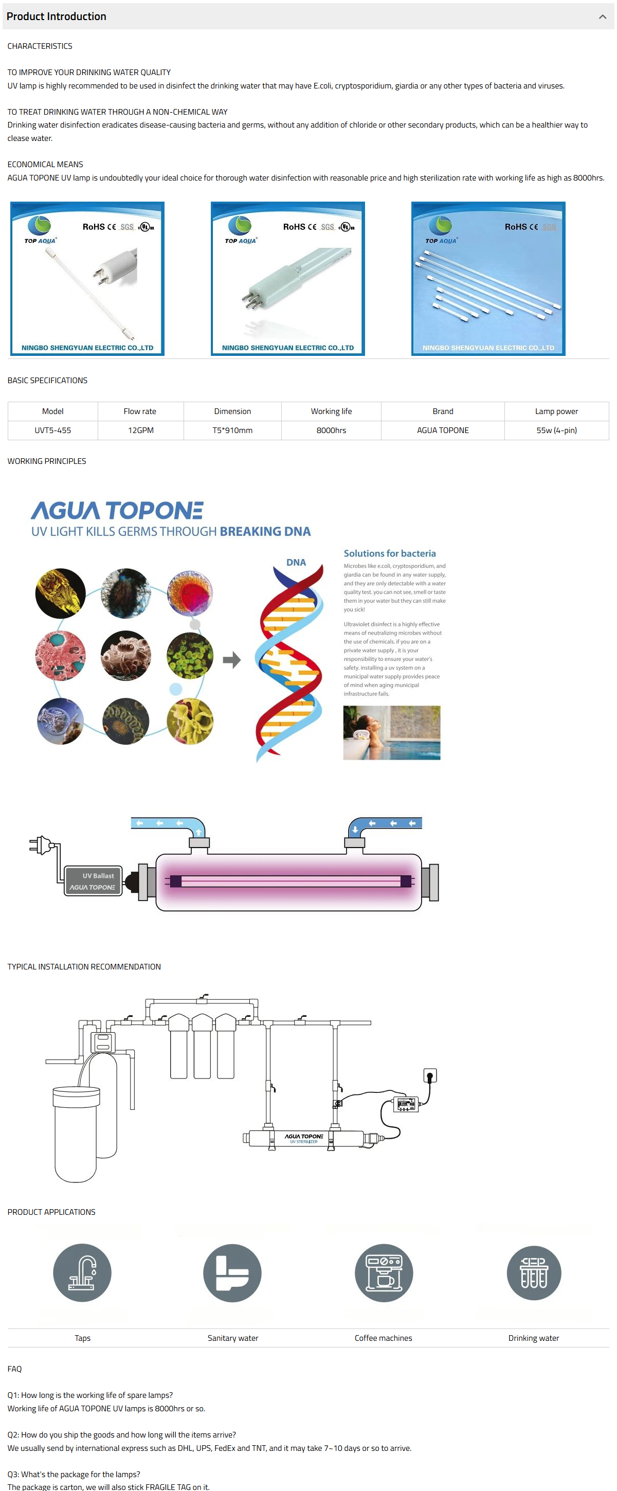 As a manufacturer for UV Water Sterilizers, we provide not only the whole set of UV Water Purifiers but also spare UV lamps.