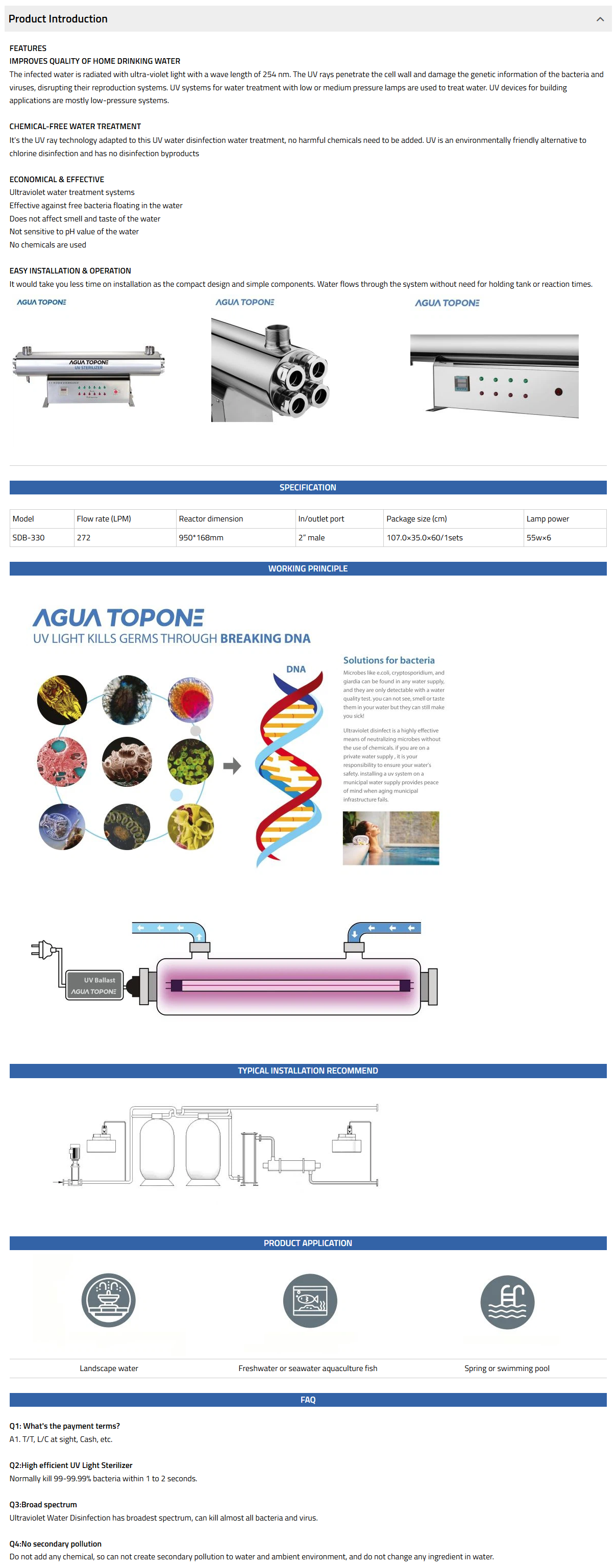 SDB UV range comes with a integrated control box underneath this ultraviolet light water treatment is highly recommended for swimming pool, hotel, school etc. The UV ballast is installed inside the control box.