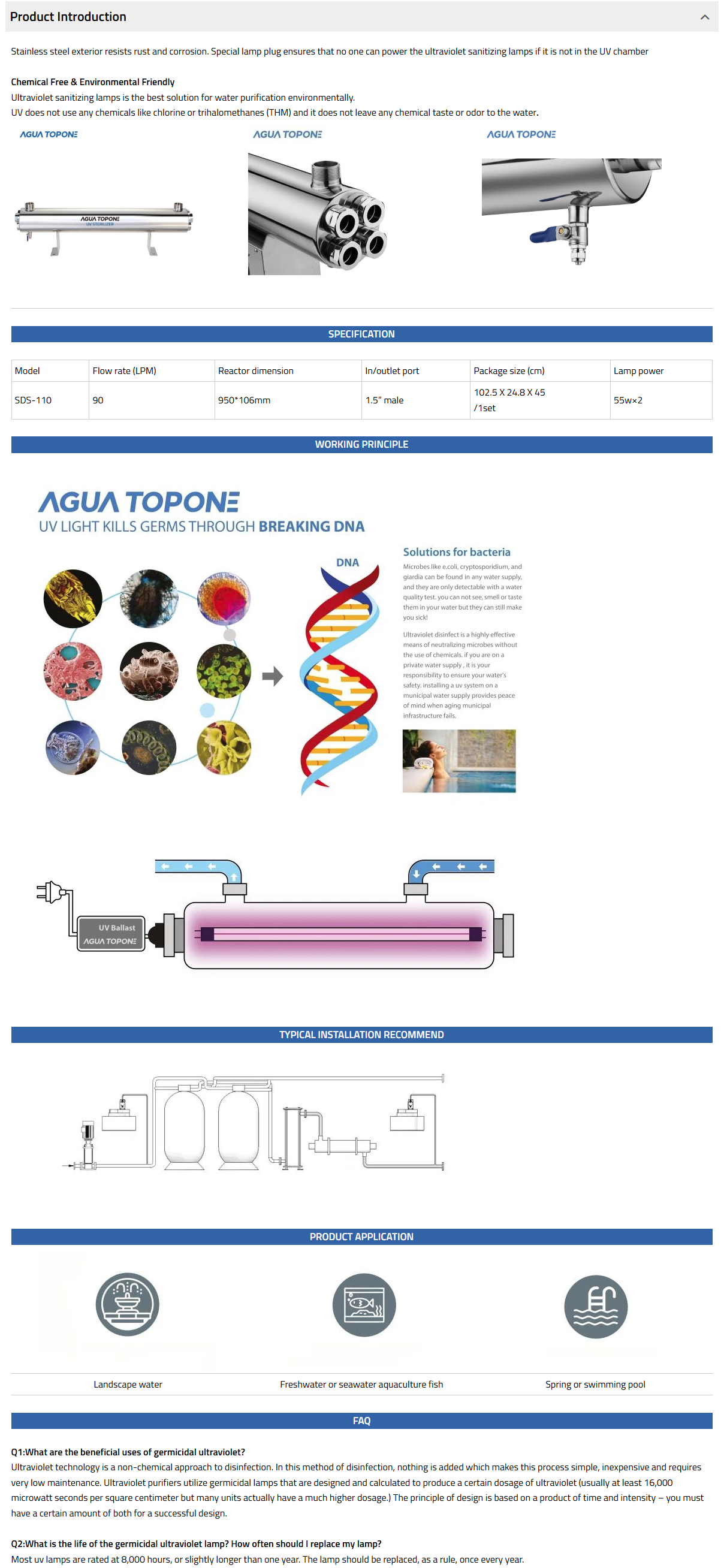 SDS UV range is mainly for commercial use which is perfect for commercial use, such as swimming pool, hotel, school etc. it comes with a stand which can be wall mounted.