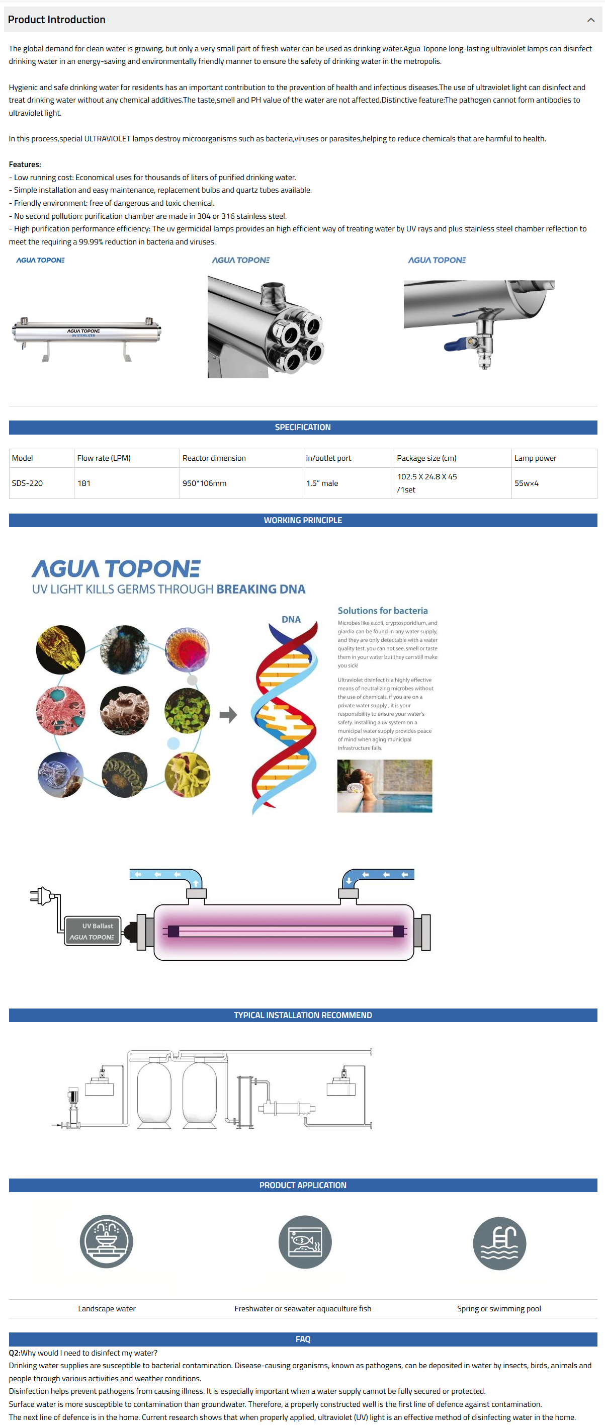 SDS UV range is mainly for commercial use which is perfect for commercial use, such as swimming pool, hotel, school etc. it comes with a stand which can be wall mounted.