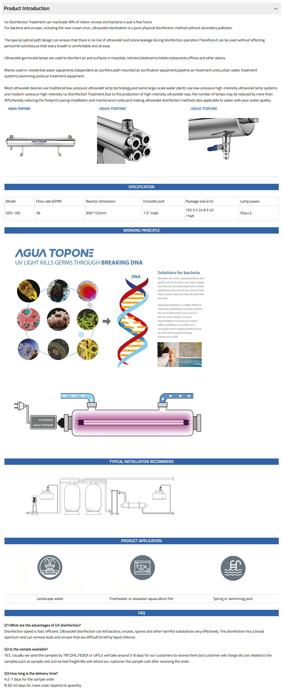 SDS UV range is mainly for commercial use which is perfect for commercial use, such as swimming pool, hotel, school etc. it comes with a stand which can be wall mounted. REQUIREMENT Maximum operating pressure: 8bar (116 psi) Ambient water temperature: 2 - 40 ℃ (36 - 104 ℉) Iron < 0.3ppm (0.3 mg / L) Hardness < 7gpg (120 mg / L) Turbidity < 1 NTU UV transmittance > 75%
