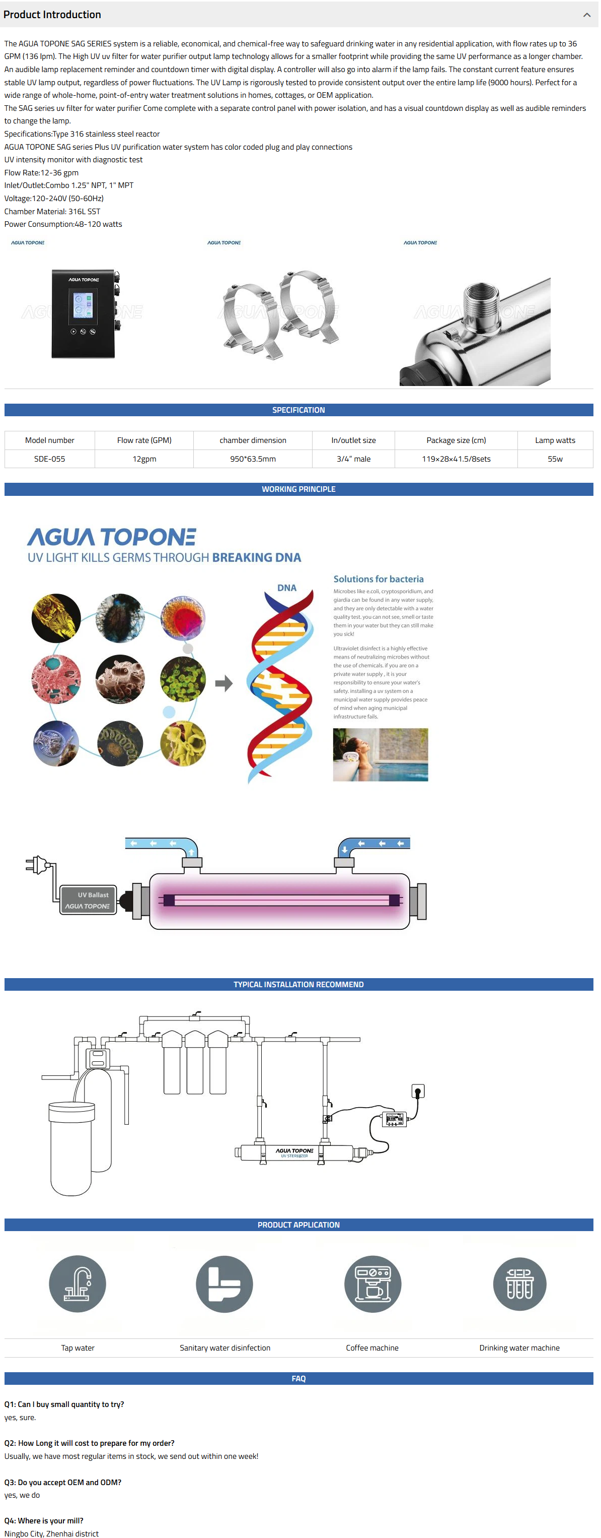 The SAG range has 3 models in the range and options to allow flexible installation, it is ideal for water tap, water disinfection system, etc.