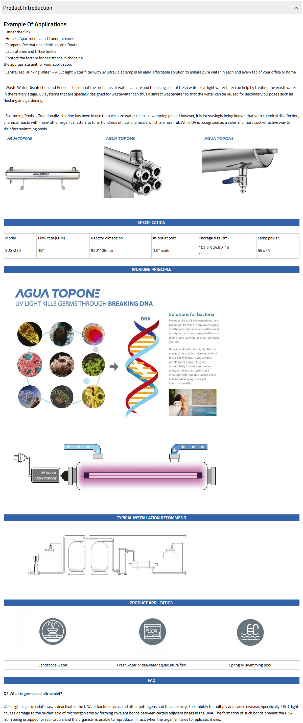 SDS UV range is mainly for commercial use which is perfect for commercial use, such as swimming pool, hotel, school etc. it comes with a stand which can be wall mounted.