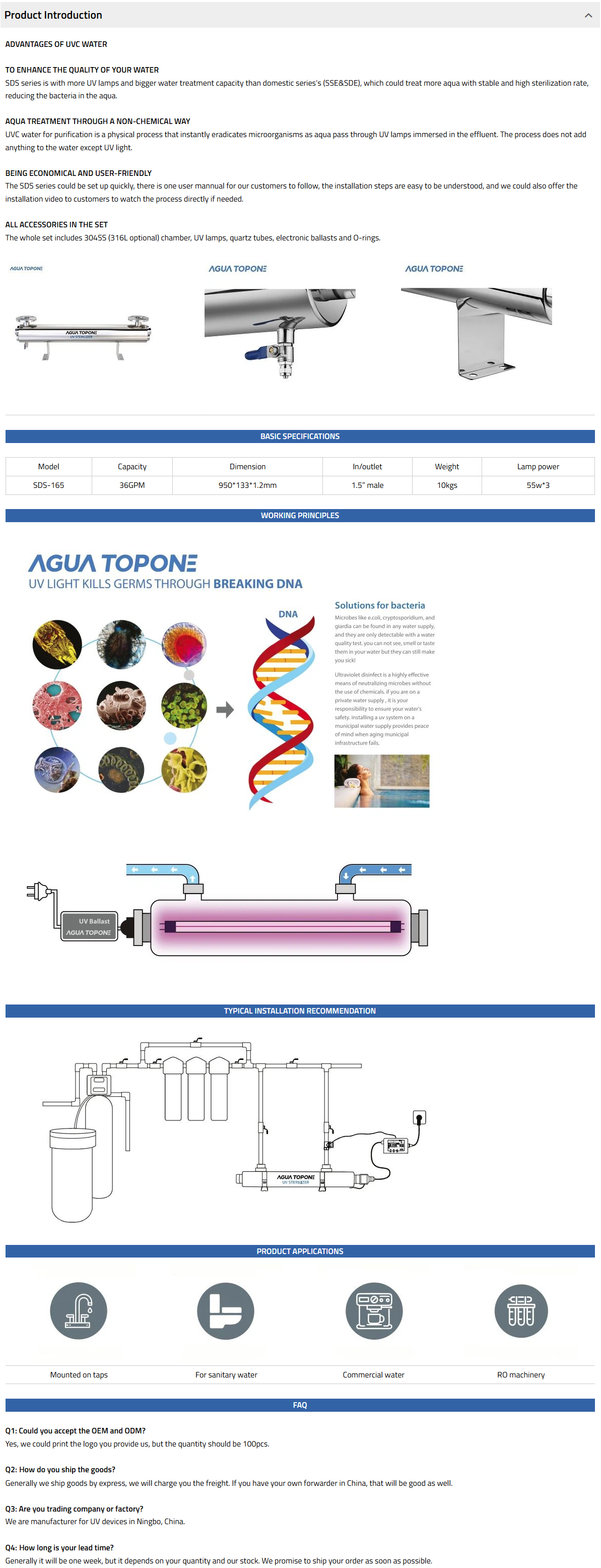 The SDS stent series, having treatment capacity from 24gpm to 144gpm, can be an good way for you to purify aqua in commercial scope.