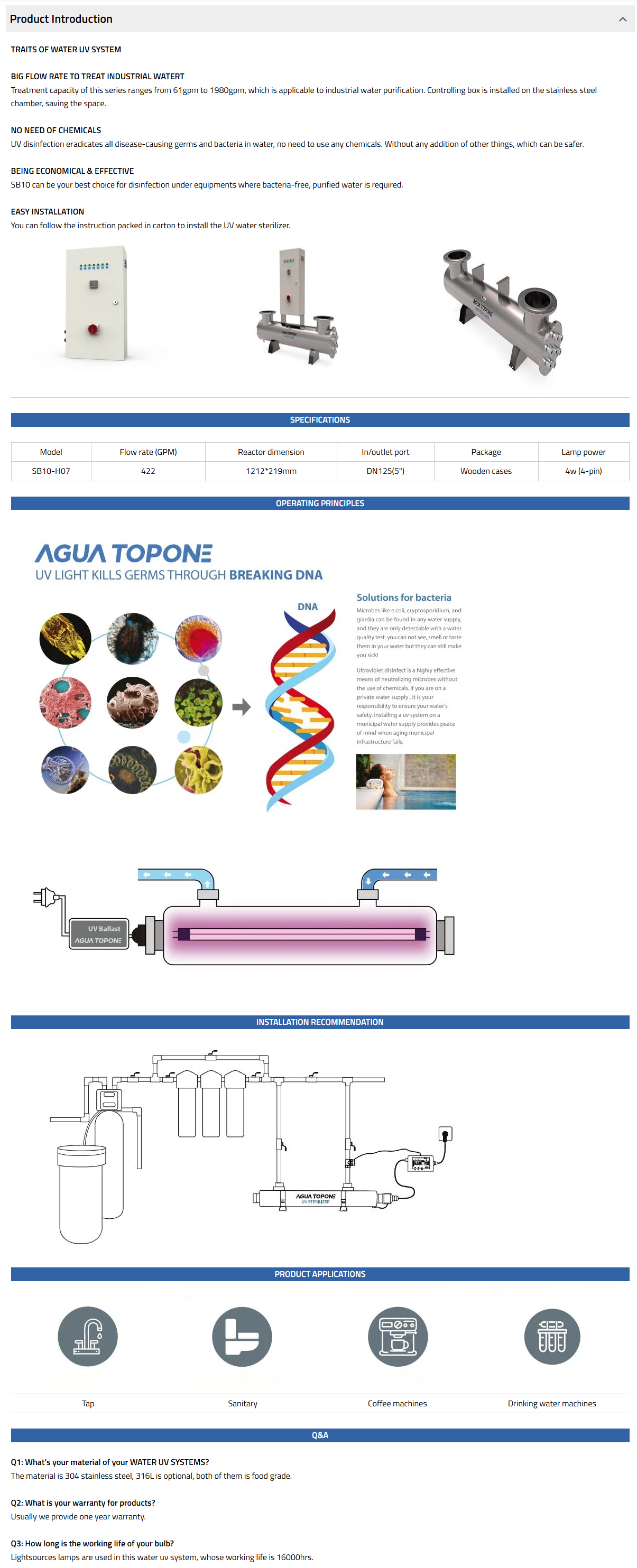 SB10 series can be an ideal choice for those need big treatment capacity, ranging from 60gpm to 1980gpm. Controlling box on the chamber to save space and being convenient to maintain.