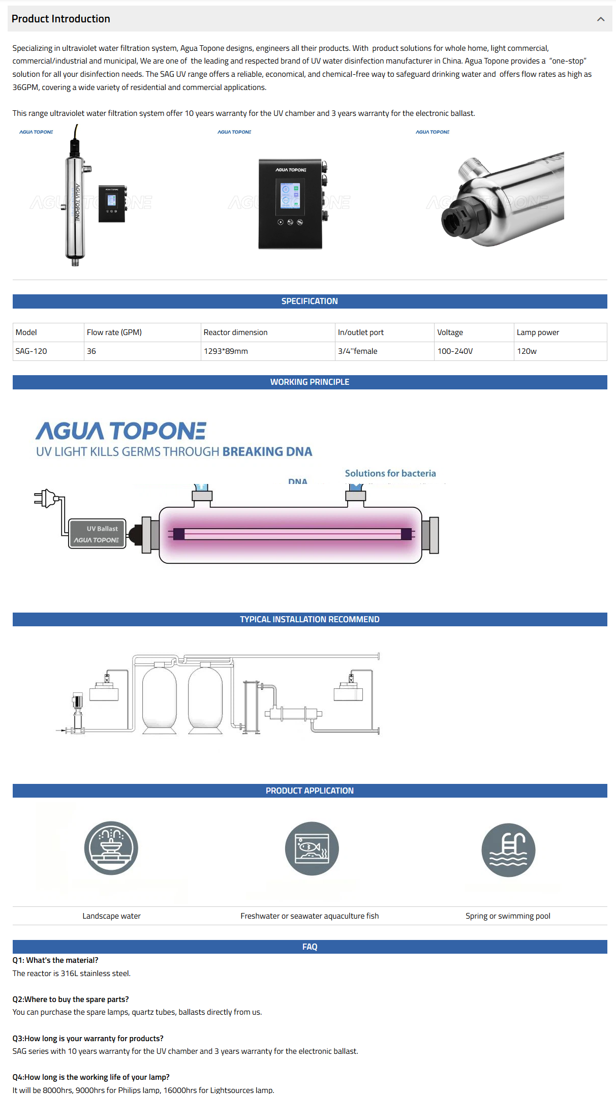 SAG UV range is mainly for commercial use which is perfect for commercial use, such as swimming pool, hotel, school etc. it comes with a stand which can be wall mounted.