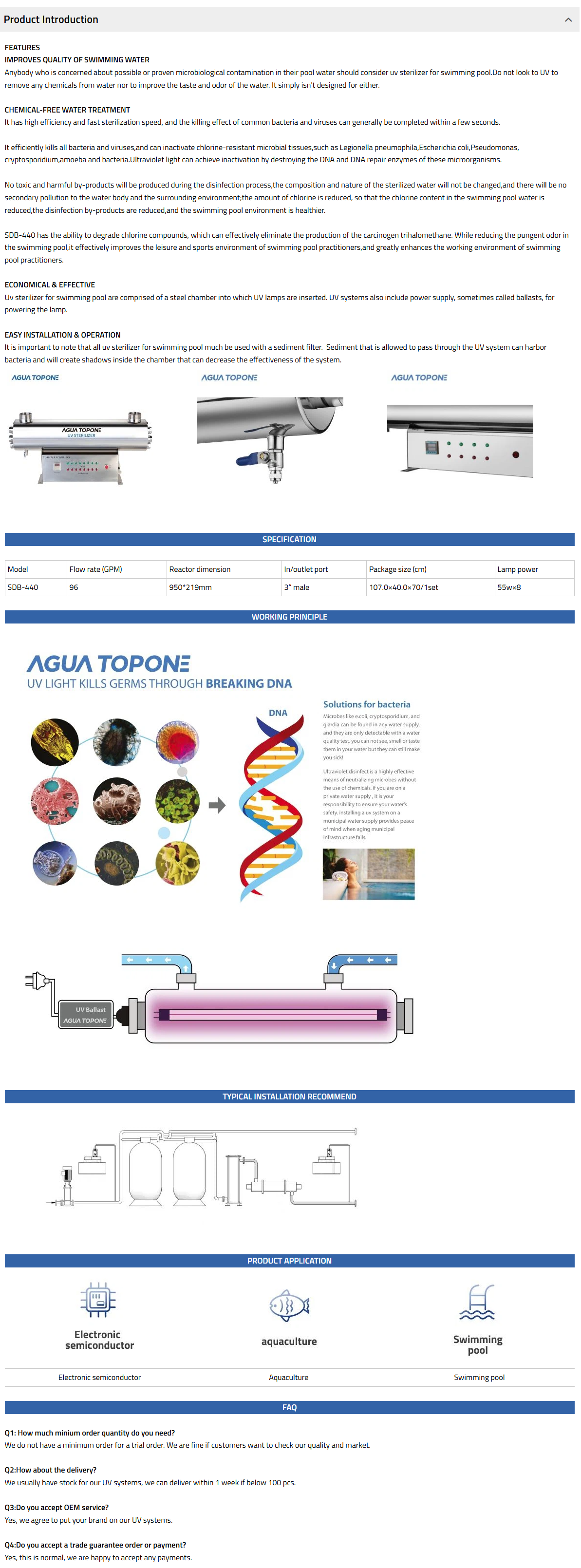 SDB UV range comes with a integrated control box underneath this ultraviolet sterilizer water treatment is highly recommended for swimming pool,hotel,school etc.The UV ballast is installed inside the control box.